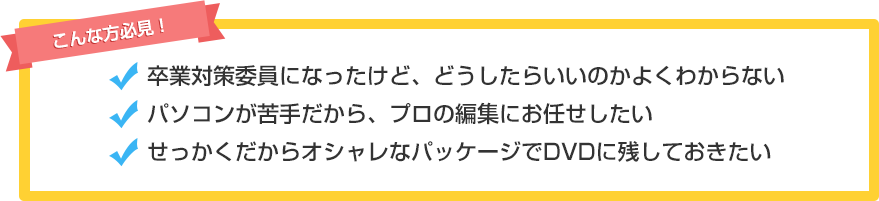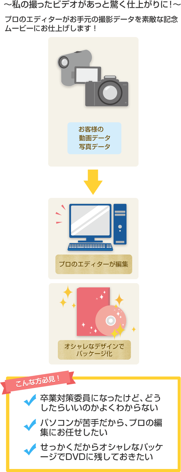 | 分数 | ●12箇所以内のテロップ ●カット編集 ●BGM挿入(お任せフリー素材) ●卒業者のエンドロール ●確認版2回(修正1回まで) ●マスターDVDまたはBlu-ray出力 |