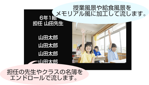 先生と児童全員の氏名をエンドロールで流します。氏名はテキストデータでご用意願います。(ワード・エクセル等)